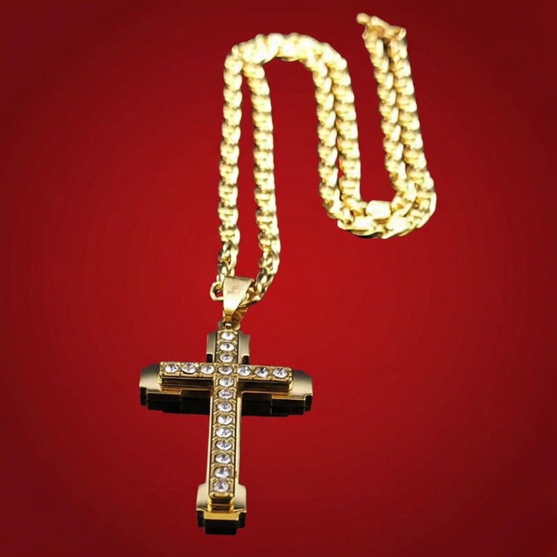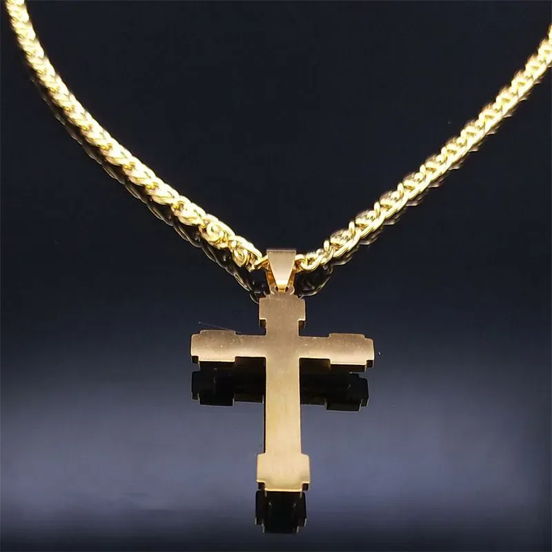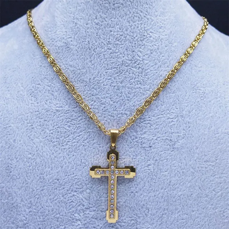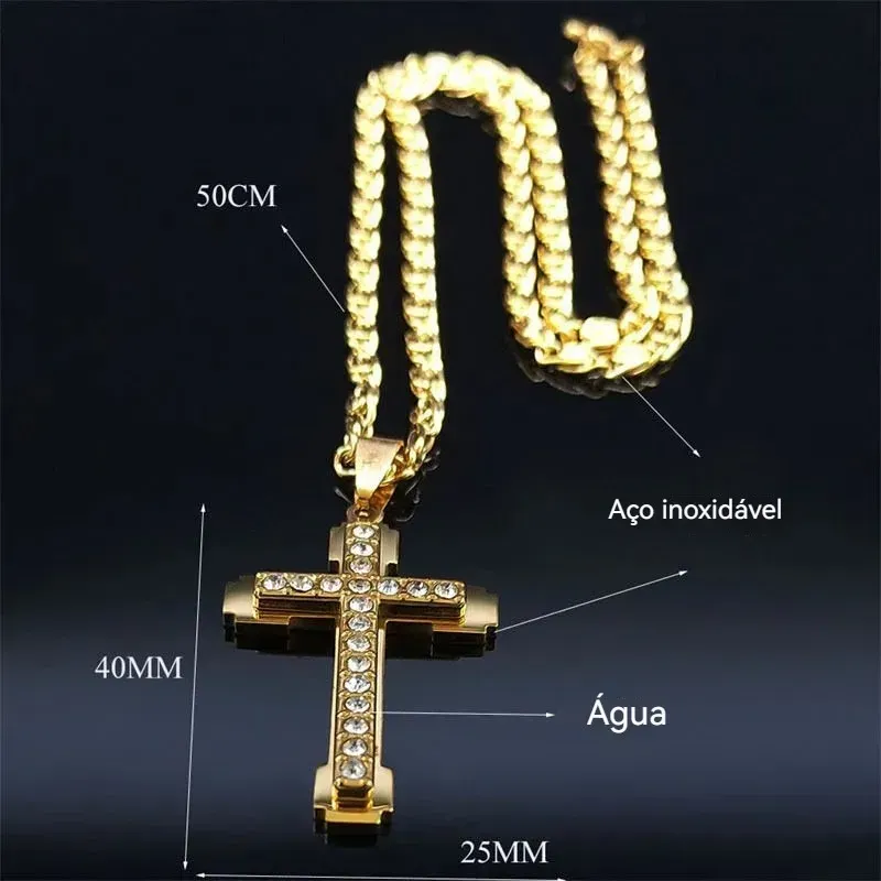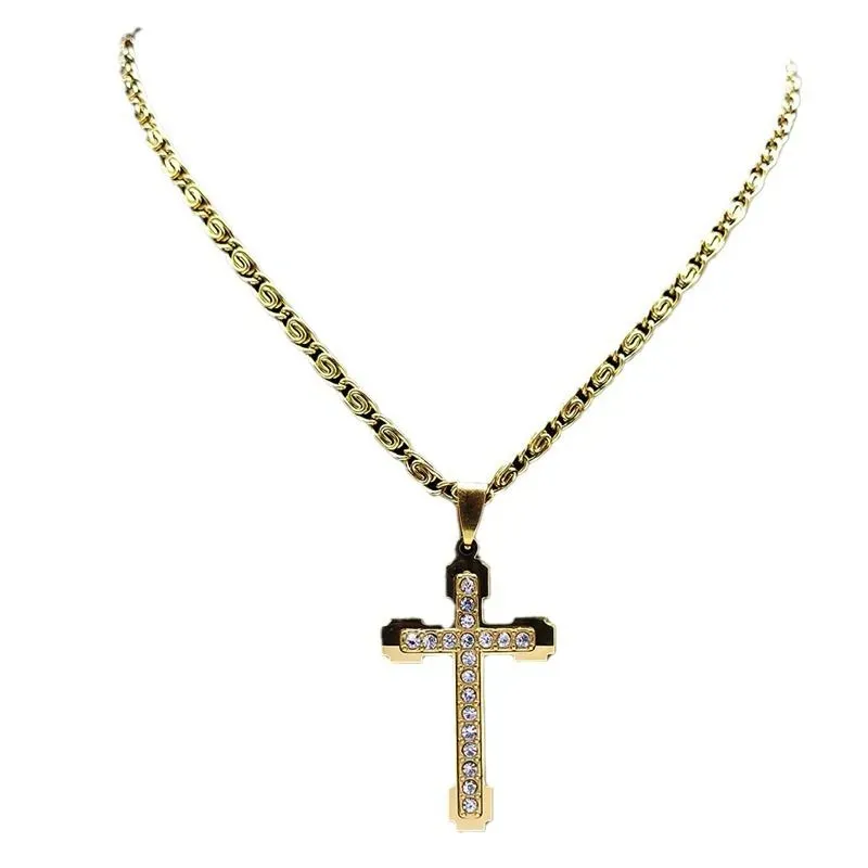 Novo colar de cruz masculino de aço inoxidável com pedras em relevo, galvanoplastia a vácuo, sem desbotamento