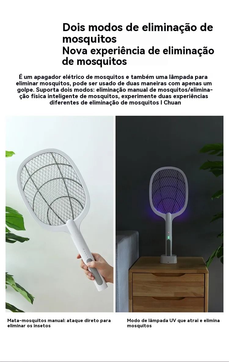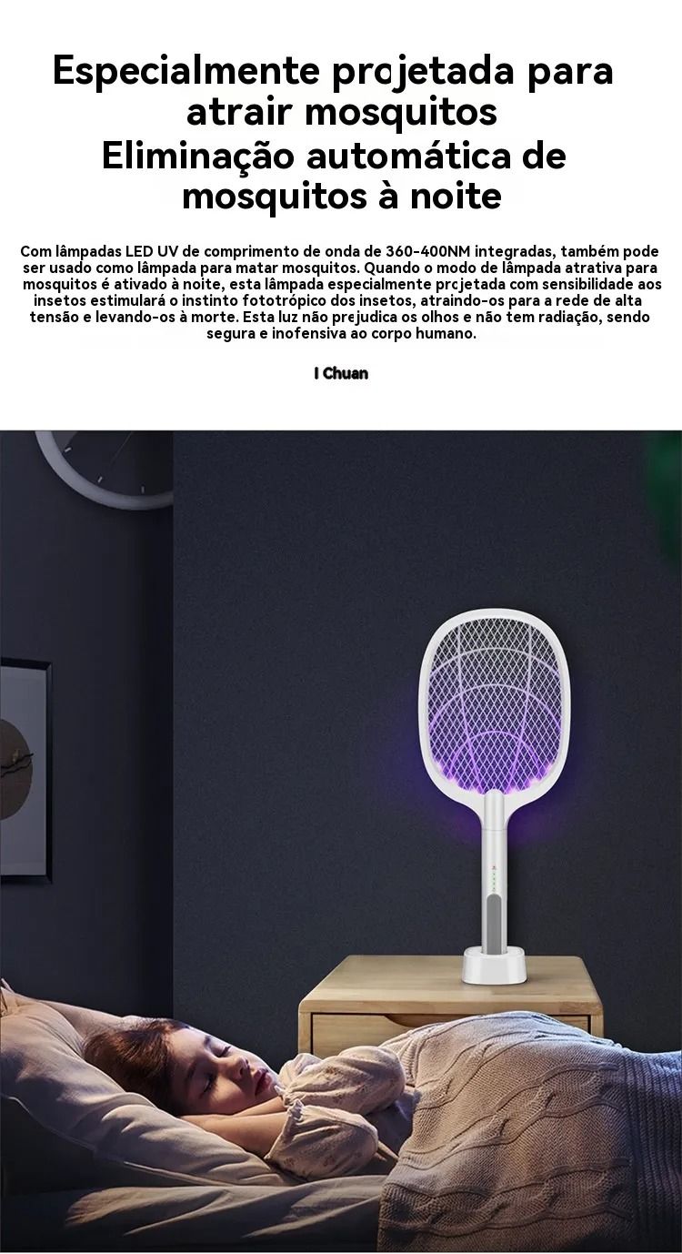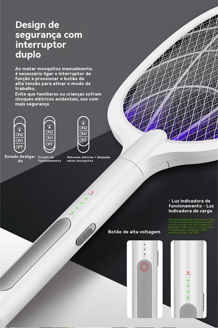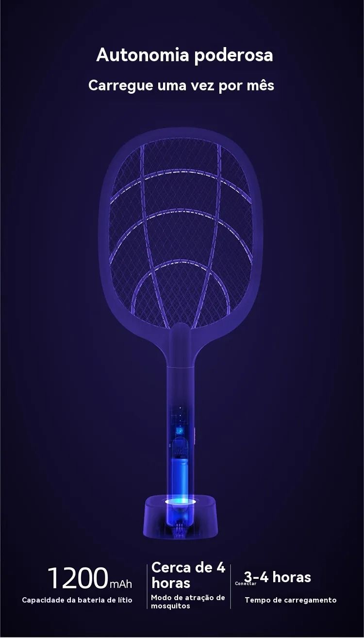 Raquete Elétrica Anti-Mosquito - Mata Mosquitos e Moscas, Atração Automática de Mosquitos